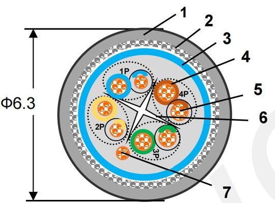 4 زوج من القطر الاسمي 0.55 ملم ، البولي إيثيلين عالي الكثافة CAT6 مع التدريع متكامل (شبكة سلك النحاس المعلبة + رقائق الألومنيوم) (HDPE) عزل البوليفينيل كلوريد غلاف موازن محموم ، IE CAT6 SF/UTP 4 × 2 × 0.55 ، 23 AWG